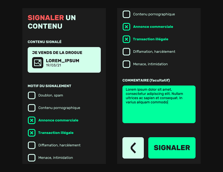 Le projet a été conçu jusqu'à la phase du maquettage, dont restent ici visibles les principales vues de l'interface et ses fonctionnalités.